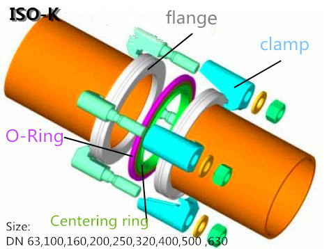 a、ISO-K真空接頭通常由法蘭(flang)、法蘭爪(clamp)、密封圈(O-Ring)、中心定位環(huán) (centering ring) 組成,見下圖。