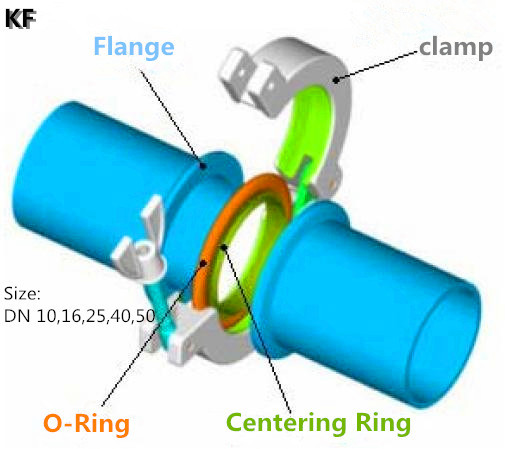ISO-KF 真空接頭通常由法蘭(flang)、快夾(clamp)、密封圈(O-Ring)、中心定位環(huán) (centering ring) 組成,見下圖。